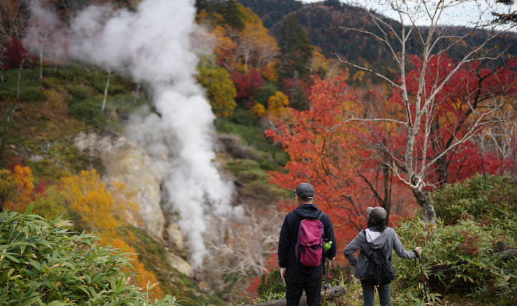ヤンベタップ沢の少し上流、煙がモクモクと上がっているところには温泉が湧いています。ヤンベ分岐から10分ほどで、ぐつぐつと湯が湧きあがる様子を覗き込むことができる展望台があり”のぞき地獄”と呼ばれています。谷を見下ろすと、色とりどりの紅葉と湯気が立ちのぼる、秋の見ごたえは別格です。