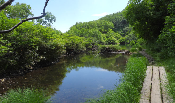 その名の通り北海道の形をしているエゾ沼。帰り道、階段を下りながら沼の形を見ると「なるほど北海道だ」と分かる楽しさがあります。道脇の水辺にはぷかーっと浮いているたくさんのサンショウウオを見られる事もあります。